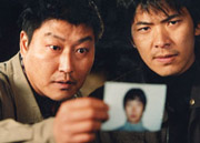◆この映画の評判は高い。IMDbのユーザー評価は、異例の8.2をつけている。だから、映画がはじまって、ソン・ガンホ演じるパク・トゥマン刑事が繰り広げるドタバタに意外な感じがした。えらく「軽薄」なテンポなのだ。なにせ、強姦殺人の現場で、ダサいマスクをした捜査課長が坂になった草原で転んで頭から転がってしまう漫才のようなシーンまである。ソ・テユン(キム・サンギョ)が登場するシーンでも、たまたま張り込みをしていたパクは、ソをを犯人だと思い、飛び蹴りしてしまう。しかし、すぐにわかったのだが、この映画は、普通なら深刻に描くことによって批判したつもりになるような技法をあえて避け、逆に、批判的な対照を喜劇的に描いているのだと。だから、ソン・ガンホがひとしきり「茶番劇」を披露したあとは、例の「軽薄」課長も退場し、新任の課長とソウルから派遣された「モダン」な刑事役のキム・サンギョのシリアスな演技が支配的になる。彼は、いわば警察の「理性」的な側面を体現しており、パクの「勘」と暴力的な「自白」に頼った「前近代」的な捜査の問題を突く。しかし、面白いのは、ソ・テユンが、最後には、自分が拒否していたはずの「前近代」と「非合理」のロジックに追い込まれていくことだろう。彼のシリアスさは、こうして疑問にふされる。