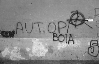 ◆題名の「ゾディアック」に関しても、両義的な解釈を示す。犯人が使う丸十字のマークの出所だが、一つは、Zodiacという名の時計のマークであり、もう一つは、映画のフィルムを上映する際のフィルムの設定位置を表示した丸十文字マークである。しかし、このマークを見たとき、わたしは、イタリアの街頭で見た右翼のグラフィティのマークを思い出した。70年代後半のイタリアでは、アウトノミア運動という新しい運動が盛り上がり、79年にはそのなかから「赤い旅団」が生まれたという嫌疑から警察と軍による大規模な弾圧が始まったが、そのさなかで、アウトノミア派のグループが街頭の壁に描くグラフィティや落書に、右翼が反対の落書を書き加えるとき、そこに付けるマークがこの丸に十字のマークだった。わたしがローマで見たものでは単独の丸十字は少なく、大抵の場合、アウトノミア派がつけるハンマーと鎌のマーク(コミュニズムのシンボル)のうえに丸と十字を重ね書きするのだった。わたしが撮った写真では、「アウトノミア・オペライア」というグループの名につけた鎌のマークのうえに丸十字を書き加え、その下に「死刑執行人(より)」と書き加えられている。「ゾディアック」事件の方がアウトノミアとその反対派の運動の方があとなので、ひょっとすると、このマークは、「ゾディアック」事件で有名になったマークがアメリカからイタリアに波及したのかもしれない。