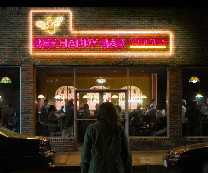 しかし、エピソード04で、殺された女性の体内にあった遺品の裏を取るために、「 LANDRYLAND」という表示のひと気のない建物に忍び込むと、そこに殺人者ハーパーが現われ、格闘になるシーンがある。ここで、殺されそうになりながら、からくも建物の外に飛び出すと、建物の表示は、「BEE HAPPY BAR」に変わり、なかには客でごったがえしている。このシーンは、タイムスリップとかフラッシュバックといった月並みな既成概念では説明ができまい。